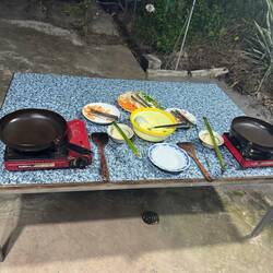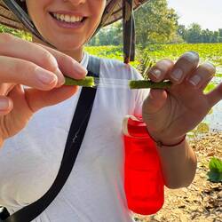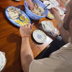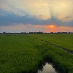 Angekommen in der Unterkunft konnten wir uns erstmal im Pool abkühlen, bevor aus auf eine Fahrradtour durch 5 verschiedene Dörfer ging. Auf dieser Tour haben wir zwei Tempel besichtigt, Susan hat uns was zum Reisanbau erklärt sowie einen lokalen Pomelogarten gezeigt, aus dem wir auch super leckere Pomelos frisch am Baum probieren konnten. Zum Abschluss waren wir auf einem kleinen Markt, auf dem wir die Zutaten für den gemeinsamen Kochabend eingekauft haben. Hier haben wir beobachtet, wie einem Frosch, typisches Essen hier, einfach mit einer Schere der Kopf abgeschnitten wurde. Das hat Antonia nicht ganz so gut verdaut 🙈Nachdem wir wieder angekommen sind, konnten wir eine weitere Abkühlung im Pool bei einer Kokusnuss aus dem Garten von Susan genießen. Auf dem Abendprogramm stand dann einen Sonnenuntergang über den Reisfeldern sowie ein gemeinsamer Kochabend.