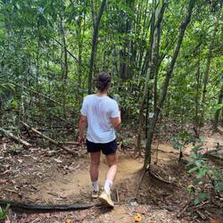 Nach unsere Ankunft gab es ein verspätetes Mittagessen, bevor es an die erste Badminton Partie ging. Der nächste Tag startet früh, da wir mit dem Roller bis zum Khao Sok Nationalpark gefahren sind, um dort etwas zu wandern. Die Strecke hatte es am Ende aufgrund der Länge, dann doch in sich, sodass wir mehrere Pausen gemacht haben. Im Nationalpark wollten wir uns keinen Guide nehmen, da viele gesagt haben, dass man die Wanderung auch ohne Probleme ohne Guide machen kann. Zu dem ein oder anderen Zeitpunkt hatten wir dann aber doch Glück genau dann an Gruppen mit Guides vorbeizulaufen, wenn diese etwas gezeigt haben, wodurch wir eine Schlange, zwei große Spinnen und eine Stabheuschrecke gesehen haben. Außerdem haben wir einige Affen und Schmetterlinge gesehen. Leider war die Wanderung am Ende kürzer als Gedacht, da sie ab einem bestimmten Punkt Touristen ohne Guide nicht mehr weiter gelassen haben, was früher wohl ging. Am Ende waren wir aufgrund der Wärme dann doch gut durch. Gestärkt für den Rückweg ging es auf dem Roller wieder zurück, wo wir 10 Minuten vor Ankunft von einem Regenschauer überrascht wurden, sodass wir uns gezwungener Maßen bei einem Privathaus unterstellten. Hier kam nach kurzer Zeit eine ältere Frau, die uns gefragt hat, wo wir hinwollen und uns einen Sitzplatz, sowie Wasser und Bananen für die Wartezeit anbot. Weiterhin wurden wir die ganze von zwei kleineren Kindern beobachtet, die sich vor Freude kaum mehr eingekriegt haben, dass wir die wie zwei nasse Pudel vor ihrem Fenster saßen. Da die Schauer hier meist sehr kurz sind, konnten wir nach Zeit auch weiter fahren. Für den nächsten Tag war nichts weiter als eine weitere Partie Badminton und Entspannung geplant. Hier haben wir uns erstmals aufgrund des Mangels an Alternativen durch verschiedene Instantnudeln probiert - eine Art war schärfer als die andere, sodass wir am Ende gefühlt Feuerspucken konnten. Nachmittags haben wir spontan noch eine Führung über das Gelände bekommen. Am