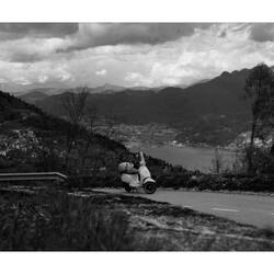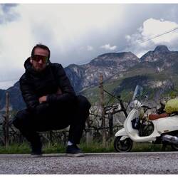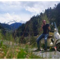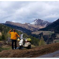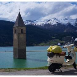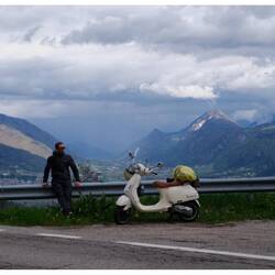 Il percorso di oggi: 290 chilometri. Dall’Allgäu passando accanto al lago asciutto di Forggensee, poi a Füssen, attraverso il Tirolo austriaco, risalendo l’Inn. Per via di un cantiere mi sono ritrovato anche per un attimo in Svizzera, e poi via sul Passo di Resia, attraverso le stazioni sciistiche, giù da Malles fino a Merano. Velocità media 45 km/h, sui passi anche solo 35 a tutto gas. Dopo ogni curva ci voleva quasi fino alla successiva per riprendere velocità. E in discesa? Raffiche di vento che mi sballottavano da una parte all’altra. Ho capito bene quanto sia leggera la Vespa. Mi ha sballottato per bene.