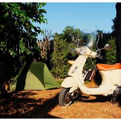 Abbiamo esplorato l’isola in sella alla Vespa, tra curve, canti e vento salato sul viso. Abbiamo piantato la tenda in un campeggio familiare, semplice ma perfetto, a pochi metri dal mare. Così vicini all’acqua che il primo caffè del mattino lo prendevamo con la vista sulle onde, e che bastava fare pochi passi per un bagno di mezzanotte nel mare caldo.