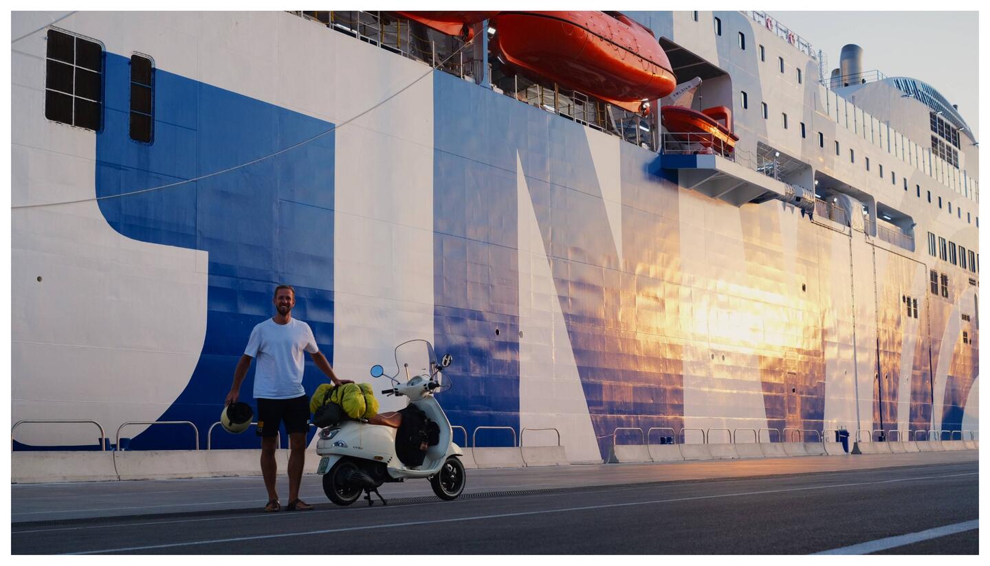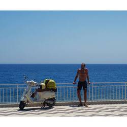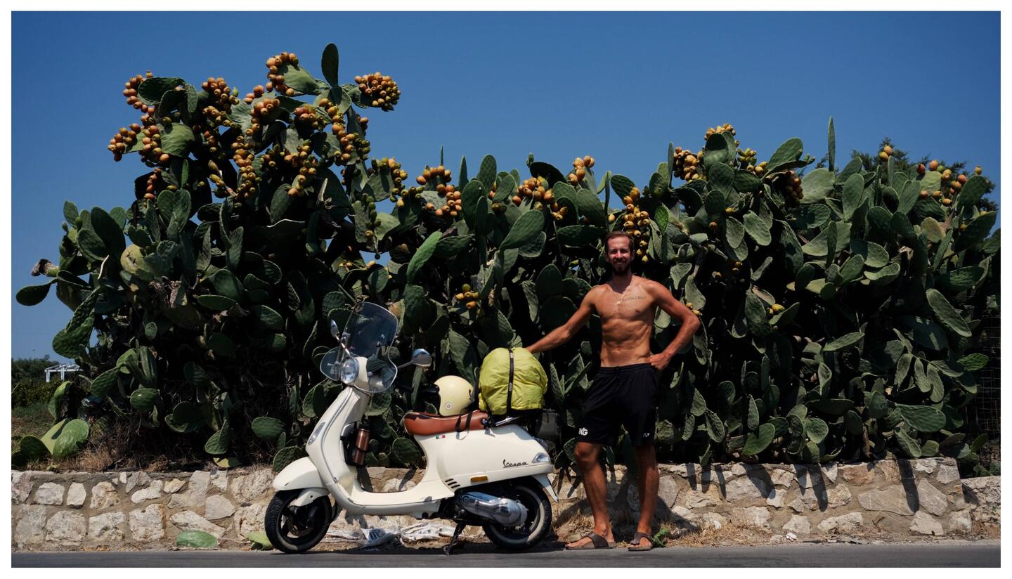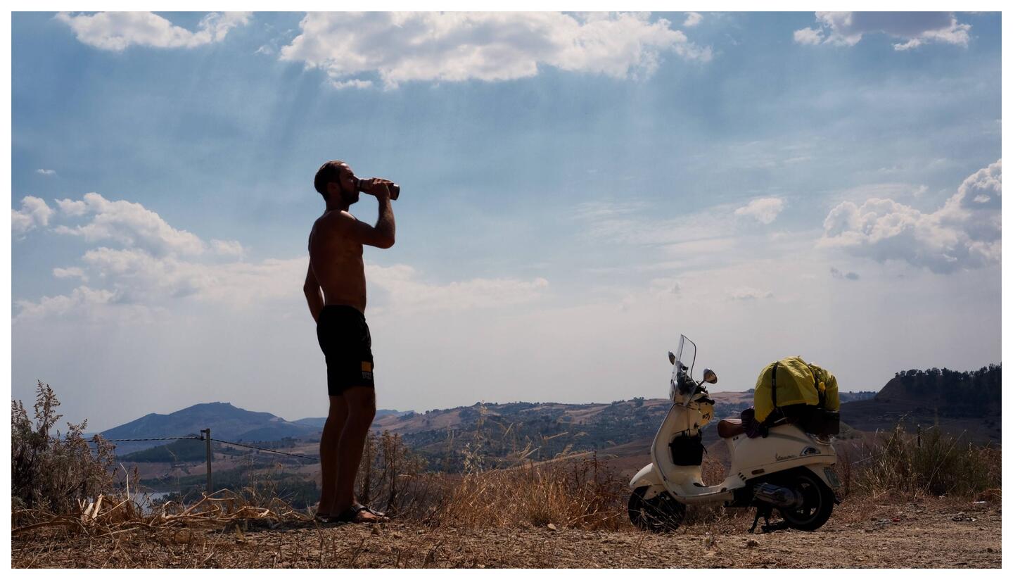Dopo quasi 9 ore di viaggio, 300 chilometri e circa 5.500 metri di dislivello, la mia piccola Vespa mi ha portato puntuale al tramonto sulla costa di Cefalù. Senza pensarci troppo, mi sono tuffato in mare per rinfrescare la testa bollente. Il frutto del carrubo – il mio snack perfetto di oggi – mi ha accompagnato mentre osservavo il cielo infuocato.