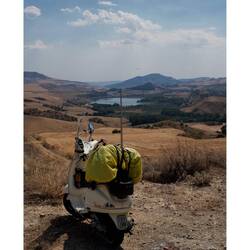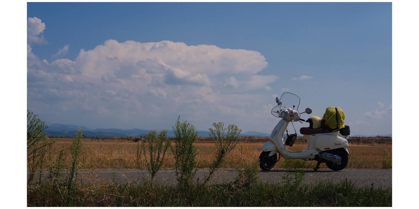 Der Tag war eine bunte Mischung aus kleinen Abenteuern: ein Wettrennen mit einem streunenden Hund auf einer verlassenen Landstraße, lange Schotterpisten, die eigentlich gesperrt waren und auf denen ich stundenlang mit meiner Vespa alleine war, und eine spontane Flucht vor einem drohenden Gewitter in den Bergen.