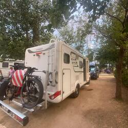 Kommunaler Stellplatz, mit allem was man braucht ausser Wifi. Anfahrt auf einer kleiner regionalen Straße durch eine schöne hügelige Landschaft.