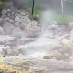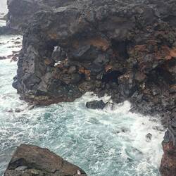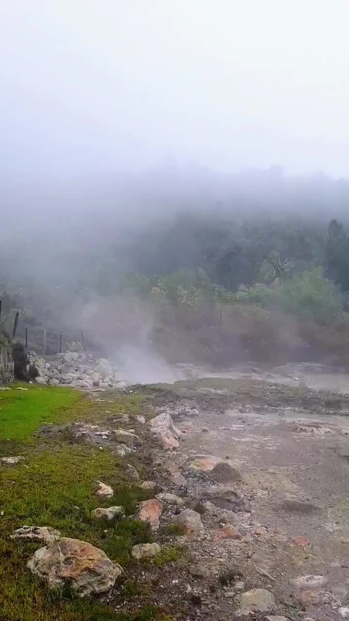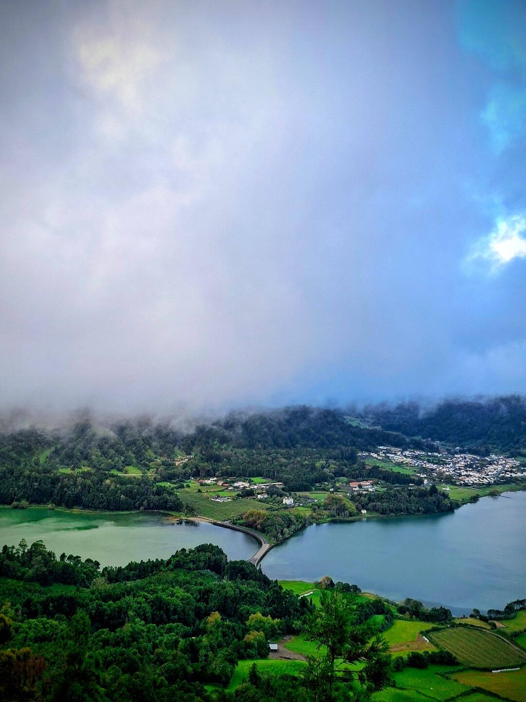 Im Vulkankrater ist ein Teil des Sees grün, der andere blau.