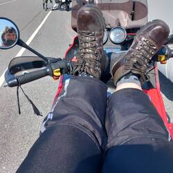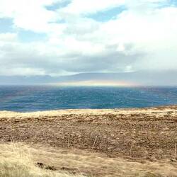 Heute sind wir aufgrund der Wettervorhersage gleich in Regenkleidung gestartet. Nach 60 km zeigte sich, dass es eine gute Idee war. Der Sturm tobte mit Orkanböen, bis 2° C kalt war es, mal Regen, mal Hagel aber die meiste Zeit doch eher sonnig. Die schlimmsten Unwetter hatten wir zum Glück umfahren. So war der Tag wieder einmal voller Wow-Eindrücke. (Da ich gefahren bin, hat Mathias das Foto mit dem Regenbgen während der Fahrt geschossen).