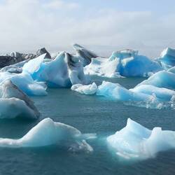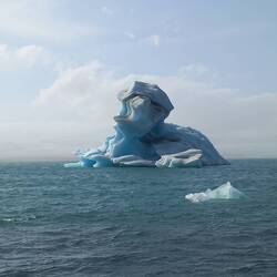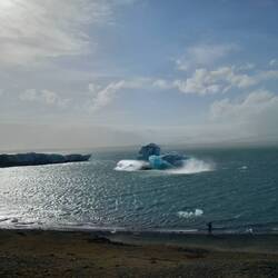 Der Eisberg der aussieht wie eine Sphinx ist vor unseren Augen zerbrochen. Das Bild danach zeigt das Ergebnis. Unmittelbar zuvor war noch ein Touri-Boot um die Sphinx gefahren.