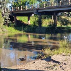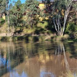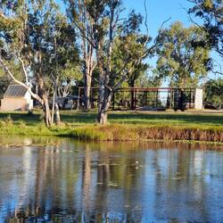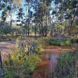 It was time to move on today, so having risen early (you know the old saying "early to bed, early to rise"), we set off from Charleville around 8am. Filled the van up with diesel, then hit the road. A few kms out of town is a lovely little area called the rock pools. We ducked in there for a quick photo, with Tom lamenting that the road was unsealed and we were going to wreck our tyres, only to find that it was just about fifty metres off the main highway. (I didn't have to say anything. Hehehe.)