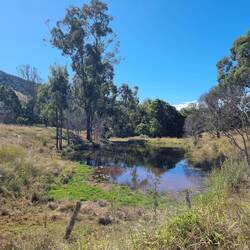It was time to move on today, so having risen early (you know the old saying "early to bed, early to rise"), we set off from Charleville around 8am. Filled the van up with diesel, then hit the road. A few kms out of town is a lovely little area called the rock pools. We ducked in there for a quick photo, with Tom lamenting that the road was unsealed and we were going to wreck our tyres, only to find that it was just about fifty metres off the main highway. (I didn't have to say anything. Hehehe.)