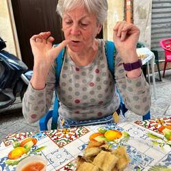 Während der Fahrt erzält Natalie von der Flagge Siziliens und der Dreibeinigkeit und dessen Bedeutung.