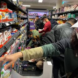 “I’ll wait for you outside,” I yelled. The tide of humanity carried me over to the candy area where our crew was literally raking chocolate bars, M & M’s, Cheetos and Chips into their shopping carts. We were all laughing.