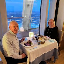 The North Pacific has been rocking and rolling. I would say the waves outside are twenty footers, big enough for the crew to put out dishes of green apples and candied ginger around the ship—both useful to subdue seasickness. We spent nearly an hour before dinner in the Atrium listening to Filip, the ship’s pianist, entertain us with selections from Gershwin, Chopin and Mozart. We had plans to dine with new friends we met yesterday. Unfortunately the wife couldn’t make it—seasickness, but her husband Clancy came, and we had wonderful dinner conversation.