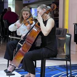 At dinner we had the wedge salad, filet mignon with foie gras and madeira sauce, and apple strudel, though Glenda had chocolate fandoodle. A cup of coffee finished the meal, and then we went to the atrium to hear pianist Filip from Poland play some classical favorites. When he finished, a string duo finished the evening with selections from Les Miserable.