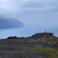 I passed a couple of cliffs overlooking our ship in the harbor, and in the clear, sunny air I couldn't resist stopping to snap a photo. Good thing I did. Thick fog soon moved in, and I couldn't see the next bend in the road.