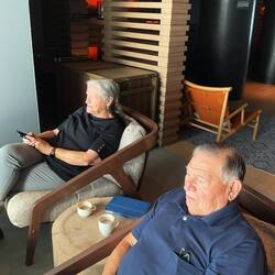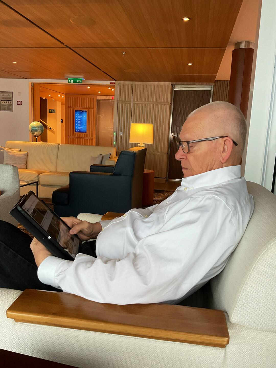 On this sea day, we are sitting in the Explorer’s Lounge with Kathy and Gil. Chuck has his hearing aids charging in the room so he is not wearing them right now. The captain came over the horn and announced “ We’re going to be closing some of the doors from the bridge and this may result in a suspension of services for a few minutes.” Chuck turned to me, looking very confused and said. “Did the captain just say that they’re going to be removing their clothes on the bridge and this may result in a suspension of services for a few minutes? What kind of drill are they having up there?”