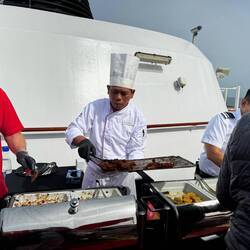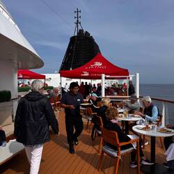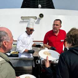 What do you do on a sea day as you sail toward Norfolk? Well, Viking planned a barbecue on deck six with potato salad and coleslaw and tossed salad and corn on the cob and jerk chicken wings and ribs and beef brisket. So of course, we ate lunch.