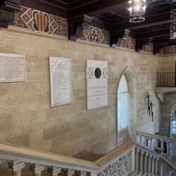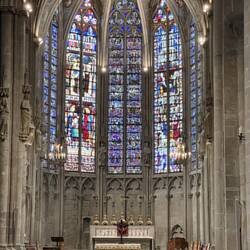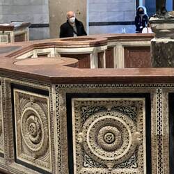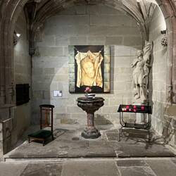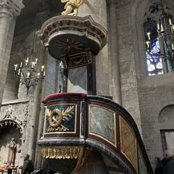 The main feature, however, that merits this cathedral’s listing as a UNESCO World Heritage Site is the Baptistery located downstairs under the sanctuary. This tiny octagonal room is filled with symbolism. In many systems of Biblical typology, eight is the number of a new beginning (after seven, the number of completion). The room has eight sides; baptism is a new birth. Effusive religious carvings adorn the walls up to a central boss in the center of the roof. On this central stone is carved the face of a stern older man with flowing beard and piercing eyes. This figure represents God the Father. Immediately below his chin is a descending dove, emblematic of the Holy Spirit. The puzzling aspect of this room is that the baby Jesus is nowhere seen. Yet it has been conjectured that the Son of God is symbolized by the presence of the human baby who would be placed in the water of the baptismal font. This ambiguous symbolism fusing human baby and human son of God would perfectly conform to the architect’s understanding of Christian humanism.