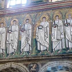 We are back in one of my favorite places in the world, the city of Ravenna in Italy. For someone interested in church history this town is like Disney World. There are still two churches here that come from the closing days of the Roman empire, the church of San Vitale and the church of Saint Apollinare Nuovo. The Emperor Theodoric was actually a German whose tribe was eventually incorporated into the Roman Empire. He built his imperial chapel, San Vitale, here in the late fifth century. It’s wonderful mosaics were designed to dazzle the observer into remembering the Biblical story of salvation history. Even the position of the tiles make them sparkle. Each of the millions of golden flecks is set tilted slightly downward so that they will reflect the light down to the observer and glitter like a jewel. Consider it late Roman cinematography, designed to tell a story so that it would be remembered. The Church of Saint Apollinare was built half a century later when Byzantine tastes froze all of the figures into frontal rigidity. Even so, its mosaics are also stunningly beautiful.