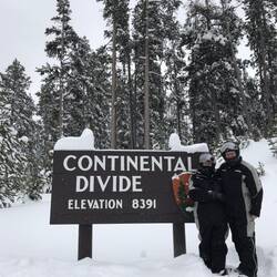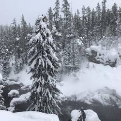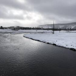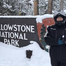 1. Yellowstone is beyond breathtaking in the winter. Snow blankets the trees, lakes are frozen, waterfalls are partially frozen and rivers cutting through a wilderness of snow offer a beautiful contrast. Amid all of this glorious beauty, we were hanging on for dear life as we scooted along at 60 mph. It was snowing and the wind was gusting at 50 mph . The snowmobile company said that our maximum speed would be 35 but the only time I saw 35 was when we were starting out. When I realized that the snowmobiles were basically motorcycles on skis, I decided that I would ride with our guide Boone on the back of his snowmobile. For seven hours I held on to my little handlebars and was very grateful that I was not driving. Chuck was behind me on his own snowmobile and I had no idea where he was or how he was doing. We both commented that the scenery would have been even more lovely had we been able to see it at about 10 mph as opposed to 50 mph. Since there had been snow the night before and all day during the day, there were no ruts for the snowmobiles to travel in and so it was a very bumpy ride. But we lived to tell the tale.