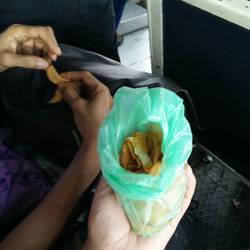 No caminho de volta, fui almoçar a um restaurante para locais. A comida é servida um prato com um plástico por cima, para não terem que lavar e comem com as mãos, tive que pedir uma comer e umもっと詳しく