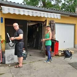 2 Stunden warten und 65 Euro später ist unser Fahrrad wieder reisetauglich! Wir freuen uns riesig! Nur noch 10 Kilometer bis zum Achterwasser.