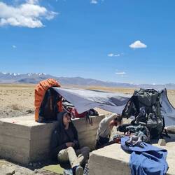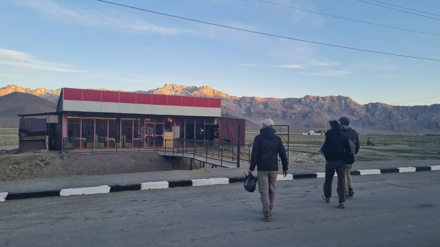 there was barely any traffic, maybe one truck every 15 minutes, so we improvised a little shelter and waited for a while until a guy importing a brand new car from china agreed to take us to our goal, murghab. he was great, we sang some german classics in the car for him.