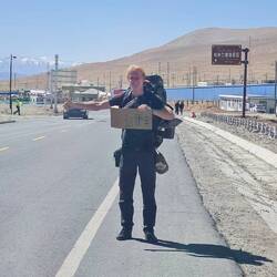 in order to get to the tajik border, some hitchhiking was in order. in china, this is just as complicated as you'd assume, but we gave it a shot. equipped with a sign that said "free ride" in mandarin, we started waving down cars on the main road. people in china rarely know the concept of hitchhiking, so we got a lot of rejections. the police even came to us because they also didn't understand what we were trying to achieve. they were nice though. finally, a younger chinese guy agreed to take us. overall, it went better than i had thought. he even stopped on the way for us to take pictures and we also saw some mountain-type camels.