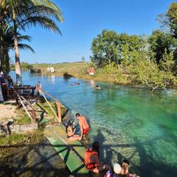 Etwas außerhalb von Bacalar verengt sich die Lagune auf wenige Meter und erzeugt dabei eine leichte Stömung (der Name ,Los Rapidos' ist etwas übertrieben). Man läuft auf einem Holzsteg ca.Read more