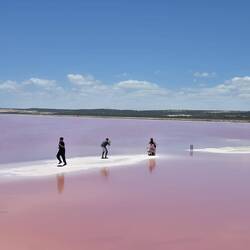 Es geht wieder 170 km weiter nach Norden und unterwegs gibt es ein echtes Highlight. Der ,Pink Lake', ein See in dem bestimmte Bakterien und Algen unter Sonneneinstrahlung für den rosa FarbtonLes mer