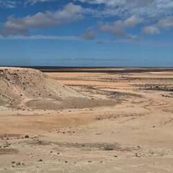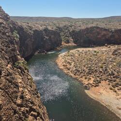 Wir fahren heute morgen 50 km an der trockenen und relativ einsamen Küste des Nationalparks entlang und machen eine Wanderung am Rande des ,Yardie Creek'. Hier sehen wir dann das erste (nichtLes mer