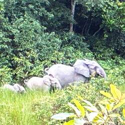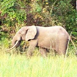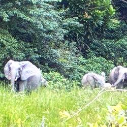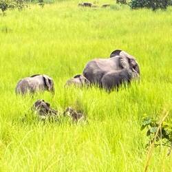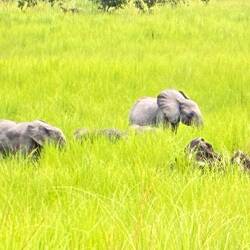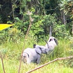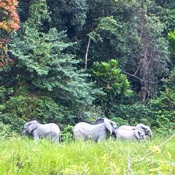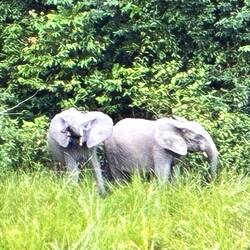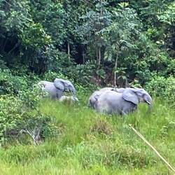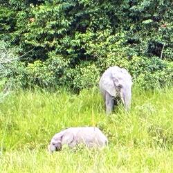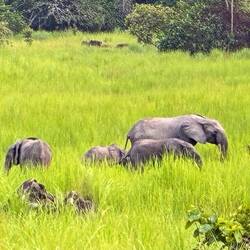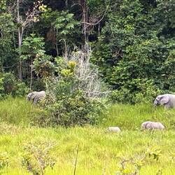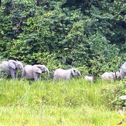 Am späten Nachmittag brechen wir zu einer ersten größeren Safari auf. Es dauert eine Weile, bis wir wenigstens Büffel und einen in den Baumkronen raschelnden Affen antreffen. Skepsis macht sich breit, ob wir diesmal auf Waldelefanten stoßen. Doch wir haben Glück. Zwischen dem Waldrand und einem Bach zeigt sich eine Gruppe von vier Tieren. Eine Leitkuh, dazu wahrscheinlich ihre jüngere Schwester und zwei Jungtiere. Eine Gruppe von Waldelefanten ist nie größer als acht Tiere.