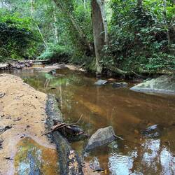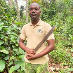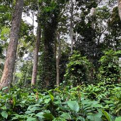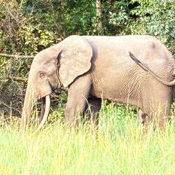 Dann wird es spannend. Wir sind etwa 10 Minuten unterwegs, da ein Elefant ganz in unserer Nähe laut aus seinem Rüssel Luft ausschnaubt. Die beiden Ranger geben uns zu verstehen, erst mal stiften zu gehen. Also kehrt und den Weg wieder zurück. Das Problem: im Gegensatz zur offenen Savanne sieht man den Waldelefanten nicht, wenn er im Wald ist. Oder man sieht ihn erst, wenn man ihm Auge in Auge gegenüber steht.