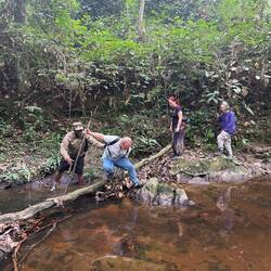 Erstes Hindernis - Überquerung eines Baches auf zwei nacheinander liegenden Baumstämmen unter Zuhilfenahme eines Stockes und eines Rangers im Wasser.