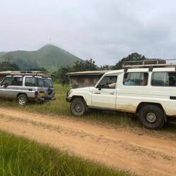 7 Uhr startet die Gruppe mit vier Geländewagen zur Fahrt ins Gorilla-Reservat. Es ist grau und regnerisch. Je weiter wir nach Osten kommen, desto regnerischer wird es. Die Tropen des westlichen Zentralafrika gehören zu den regenreichsten Gebieten der Erde. Auch in der aktuellen „Trockenzeit“. Es blitzt und donnert. Der Scheibenwischer wischt nicht mehr. Kein Grund zum Anhalten. Man orientiert sich einfach auf wenigen Metern Sicht am Rücklicht des vorausfahrenden Autos. Halleluja. Nach ca. 100 km auf asphaltierter Straße geht es noch ca. 20 km durch die Wildnis auf schlammigen Pisten. Als wir das Basislager erreichen schüttet es aus Gießkannen.
