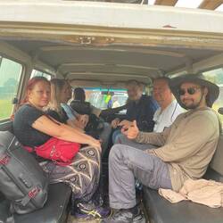 Neben dem Penguin Travel Reiseleiter aus Frankreich und dem lokalen Reiseleiter aus Gabun sitzen 2 Bulgaren, 2 Deutsche, 2 Briten, ein US-Amerikaner, ein Australier, eine Neuseeländerin, ein Däne, eine Norwegerin und ein Italiener im Bus.