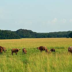 Wie üblich sehen wir nach einer Stunde lediglich einzelne Büffel in der Buschsavanne, ansonsten viel Gras in der Nähe und viel Wald in der Ferne. Bevor wir gar nichts mehr sehen würden, nutzen wir die erste (und letzte) Büffelherde, um abzusitzen und draufloszuknipsen. Büffel abgehakt.