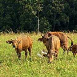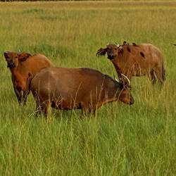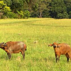 Wir wechseln die Richtung und steuern vom Regenwald dem Meer zu. Auf einer Lichtung begegnen wir einer Herde Rotbüffel, die ich bisher immer als Waldbüffel bezeichnet habe. Auf nette Fotos haben die aber auch keine Lust. Nach zwei verwirrenden Kurvenläufen trabten sie ebenfalls auf nimmer Wiedersehen ins Dickicht des Waldes.
