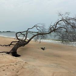 Vorbei an verfallenden Baracken eines aufgegeben Camps erreichen wir den Küstenstreifen am Atlantik. Wir stehen in einem Blütenmeer, welches eine der Lieblingsspeisen der Elefanten darstellt. Küstenspinat. Daneben stehen zwei Bäume, welche ebenfalls Elefanten mit Leckereien locken. Mangobäume. Interessant ist, dass sie aber nicht nur deren Früchte sondern auch die Borke verspeisen. Nachweislich kann man mit einer Lösung der Baumrinde Zahnschmerzen lindern. Offensichtlich haben die Waldelefanten auch die Erfahrung gemacht, dass die Rinde schmerzlindernd ist.