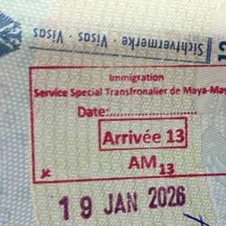 17:00 Uhr geht es wieder hinauf über die Wolken und noch vor 18:00 Uhr wieder herunter. Interessante Variante des Ortsnamens im Einreisestempel. Man könnte denken, dass ich statt in Brazzaville im Kongo auf Yucatan in Mexiko gelandet bin.