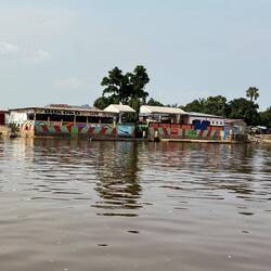 Nach der Stadttour im Bus wechseln wir zu einer Bootstour aufs Wasser. Wie gerne wäre ich doch nur für einen kurzen Moment am anderen Ufer angelandet und kurz in Kinshasa ausgestiegen. Aber die DR Kongo muss noch warten. Unsere Tour führte uns gegen den Strom zu ein paar Flussinseln, die zum Teil bewohnt oder wieder verlassen im Kongo liegen. Die Zwillingstürme sind das einzig Interessante an der Stadtansicht. Kinshasa hat da deutlich mehr zu bieten als Brazzaville.