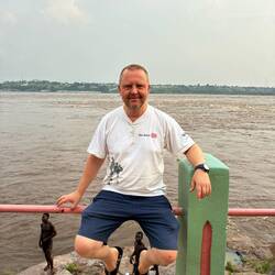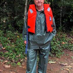 Da hocken wir nun. Ein Ende des Regens ist nicht abzusehen, es rauscht in Gardinen vom Wellblechdach hinab auf den Boden. Ein Ranger bringt Regenjacke und -hosen. Ein anderer trägt Schwimmwesten herbei. Es dauert noch eine ganze Weile des Wartens, doch schließlich kommt der Marschbefehl. Ich schlüpfe in meine Anglerausrüstung, schnappe mir eine der orangefarbenen Westen und trete ins Freie. Tatsächlich, es nieselt nur noch etwas, nach ein paar Minuten auch das nicht mehr. Wir gehen zum Fluss und besteigen drei Boote. Nach kurzer Fahrt erreichen wir die Insel des Verbannten. Die Zusammenhänge sollte ich erst später verstehen. Ein Anlanden ist hier nicht möglich, der etwa 25 jährige Silberrücken ist kein Softi und alles andere als Anhänger einer sentimentalen Willkommenskultur.
