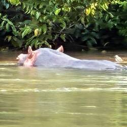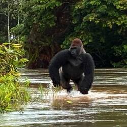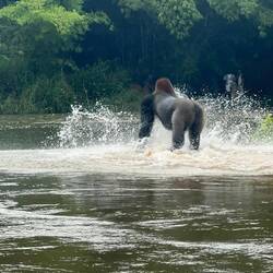 Abfahrt. Auf dem Rückweg kommen wir an einem Flusspferd vorbei, dass ob des Motorboot-Geschwaders rasch abtaucht. Und dann steht wieder unser Verbannter vor uns, der als Serientäter längere Zeit sein Unwesen im Wald getrieben hat. Nachdem er wiederholt Jungtiere getötet hat, entschloss man sich, ihn auf eine weiter entfernte Insel zu bringen, die er nur schwer verlassen kann. Er könnte es, da Gorillas im Unterschied zu Schimpansen ein wenig schwimmen können, aber er fügt sich seinem Schicksal.Read more