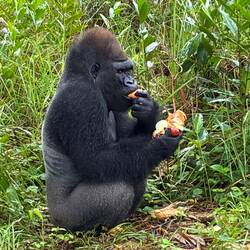 Man kann nicht einfach einen Gorilla mit dem Boot hierher bringen, das Türchen öffnen, alles Gute wünschen und hinterherhinken. Die Tiere können aus unterschiedlichsten Gründen zutiefst aggressiv sein und ihre gutmeinenden Begleiter umgehend angreifen. Wenn die Tür aufgeht, darf es kein Zurück mehr geben - zum Wohl aller Beteiligten. Manche verschwinden sofort, streunen allein umher oder schließen sich - früher oder später - mit anderen zu einer Familienbande zusammen. Alle sind sie Teil einer inzwischen 70 Tiere umfassenden Gorilla-Gesellschaft, die sich stabil entwickelt. Manche brauchen für die Umgewöhnung etwas länger. So wie das Männchen, welches hinter dem Zaun genüsslich die ihm hinübergeworfenen Zwiebeln, Maiskolben, Bananen und Salatköpfe verspeist. Man darf durchaus von speisen sprechen. Alle Früchte werden sorgfältig geschält und nur das Innere wird verzehrt. Besonders faszinierend finde ich das fachmännische Schälen der Zwiebel. Nur die bräunliche Pelle wird entfernt, ansonsten geht nichts verloren. Das bekomme ich noch nicht mal so geschickt mit meinem Gemüsemesser hin. Er ist noch nicht so lange hier und braucht noch ne Weile. Er kam aus London. Der dortige Zoo hat nur eine Kapazität für 12 Tiere. Überzählige Tiere müssen weg. Im günstigsten Fall dahin, wo sie herkommen. Einst lief er als Gorilla-Junges schon einmal durch den Kongo. Dann wurden seine Eltern erschossen und er einem Zoo verkauft. Ein fürchterlicher Kreislauf.
