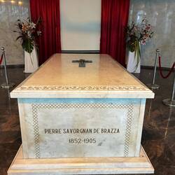 Bei der Stadtführung fragten wir den einheimischen Reiseleiter, ob es ein Museum gäbe. Nein, gäbe es nicht. Und das Brazza-Museum? Da ist nichts drin. Nun gut, wir versuchen es heute selbst. Wir kommen hinein. Es stellt sich heraus, dass das Brazza-Museum kein Museum ist sondern ein Mausoleum für de Brazza und seine Angehörigen. Natürlich ist da außer den Särgen nicht viel drin. Ich erwarte im Lenin-Mausoleum ja auch keine Matroschka-Sammlung oder eine Ausstellung traditioneller Jurten der Jakuten. Ich bin mit Aristide und Dagmar unterwegs. 10 CFA soll der Gang ins Untergeschoss zu den Grabmonumenten kosten. Wir lehnen dankend ab. Nachdem wir uns für die Gräber nicht zu interessieren scheinen und somit auch keine Einnahmen in Aussicht stehen, wird uns angeboten, für zusammen 5.000 CFA doch hinunterzugehen. Also gut. Die Flexibilität des Aufsehers bei der Preisgestaltung lässt vermuten, dass hier an sich gar kein Eintritt erhoben wird und das Geld direkt in die eigene Tasche fließt.