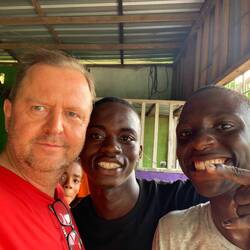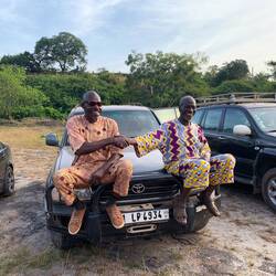 Die drei Pechvögel ohne Koffer am Anfang der Reise - Dagmar, Ludger und ich - saßen im fahrenden Wagen. Das sollte sich als großer Glücksfall erweisen. Wir schafften die Fahrt über eine unbefestigte und unbeleuchtete Lehmpiste mit zahlreichen Schlaglöchern bis zum Dorf Kambama gegenüber Tiwai Island gerade noch bei Tageslicht. Wir wurden freundlich begrüßt. Die Taschen wurden von Einheimischen geschultert und aufs Boot gebracht. Mittlerweile war es 18:30 Uhr und die Dämmerung brach herein.