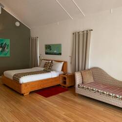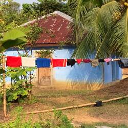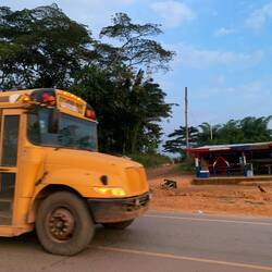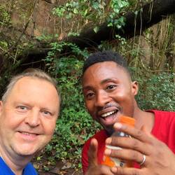 Kaum, dass wir starten wollten, brachen die Wolken entzwei und ließen ihre Massen von wütendem Donner begleitet auf den Regenwald prasseln und die Wege in einem Augenblick zu Bächen mutieren. Bobo lächelte und sagte „Let‘s wait 5 minutes“. Wir warteten nicht, gaben ihm das Geld und wünschten ihm eine gute Heimfahrt.Læs mere