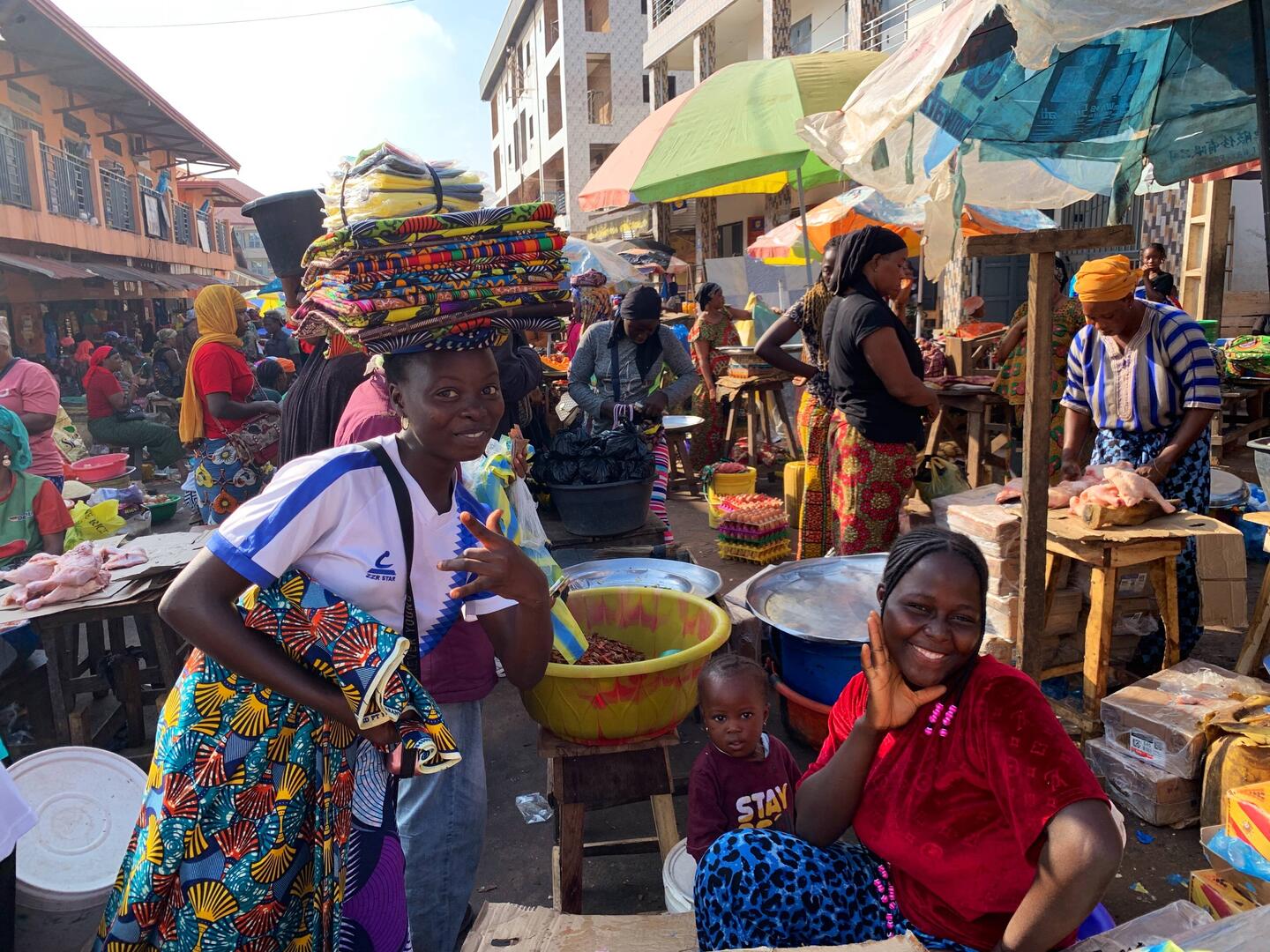 Eine Nacht unter dem Moskitonetz brachte ausreichend Schlaf in den Körper und das Frühstück ausreichend Energie. Auf geht es. Zuerst streiften wir durch den Markt von Kindia. Die Bereitschaft, sich fotografieren zu lassen, war weniger ausgeprägt als die Bereitschaft zu lächeln.