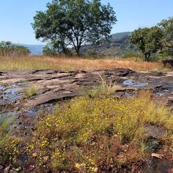 Den menschlichen Spuren folgten wir nach unserer Anlandung in zwei Fahrzeugen auf der bereits bekannten Sand-Lehm-Piste, die bereits getrocknet und nur von wenigen Pfützen garniert war. Die glänzenden oder dunkel im hellen Boden eingeschlossenen Pfützen waren eine hilfreiche Markierung der Schlaglöcher, denen wir ohne Wasser weniger gut ausweichen konnten, da wir sie zu spät gesehen hatten.