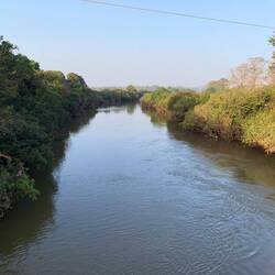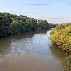Auf der anderen Uferseite hatten wir mehr Glück. Drei Affen kletterten in einem entfernten aber relativ gut einsehbaren Baum durch das spärlich beblätterte Geäst.