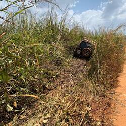 Die Piste war unbefestigt, so dass man bisweilen das vorausfahrende und in einer Staubwolke eingehüllte Auto kaum so. Doch plötzlich war das vor uns fahrende Auto samt Staubwolke verschwunden. Das mittlere Konvoi-Fahrzeug war von der Straße abgekommen und eine Böschung gerauscht.