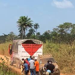 12:05 Uhr hielt unser Fahrer plötzlich an, um mit dem Radkreuz die Muttern der Reifen nachzuziehen. Vielleicht hatte die Sierra Leone Luft die Muttern gelockert? Als alles wieder fest war, ging es weiter?